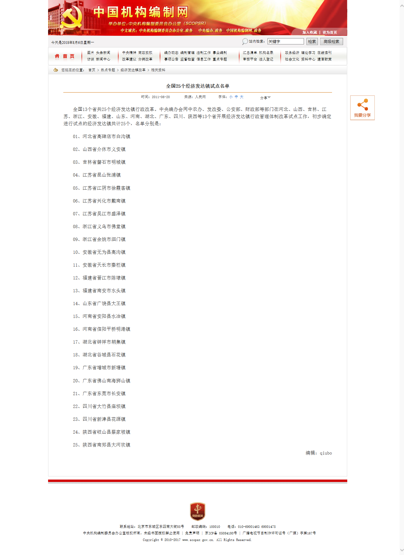 2010年6月,中央編辦會(huì)同中農(nóng)辦、國家發(fā)改委、公安部、財(cái)政部等部門在13個(gè)省25個(gè)鎮(zhèn)開展經(jīng)濟(jì)發(fā)達(dá)鎮(zhèn)行政管理體制改革試點(diǎn)工作,并在工作座談會(huì)發(fā)布全國25個(gè)經(jīng)濟(jì)發(fā)達(dá)鎮(zhèn)試點(diǎn)名單。
